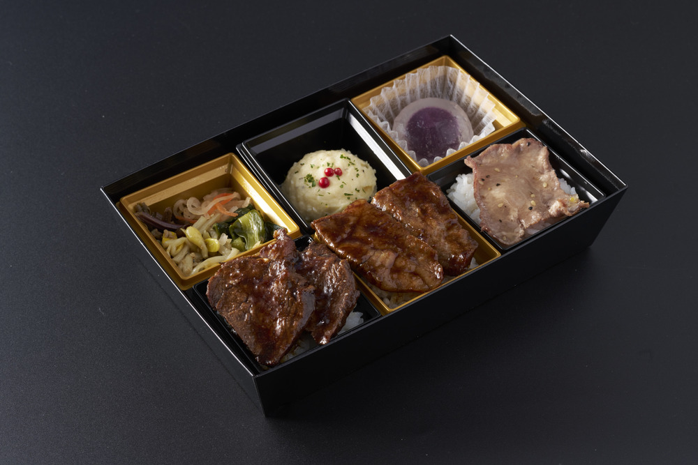 這是一款可以享用牛舌、黑毛和牛カルビ、牛橫隔膜拼盤的豪華便當。