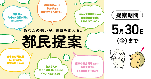 東京都實施了將市民的聲音反映於預算編制與政策制定的「市民事業提案制度」(市民提案)。我們將把大家提出的建議反映到令和8年度東京都的施策中,期待大家積極踴躍的參與!