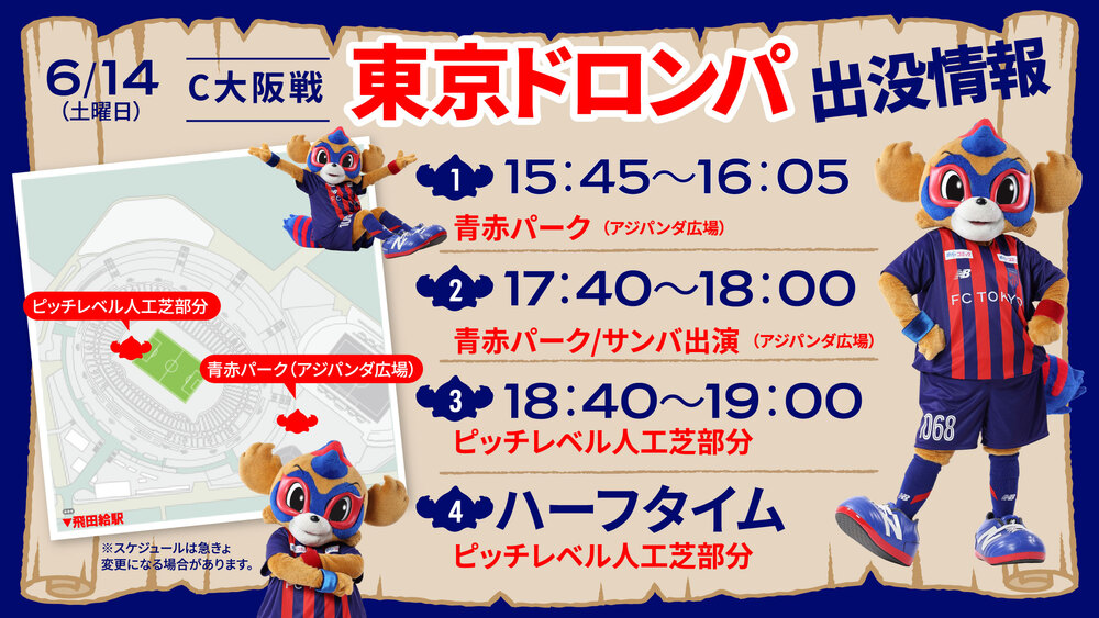 6月14日(周六) 2025明治安田J1聯賽 第20節 vs Cerezo大阪(19:00開球/味之素體育館) TOKYO DOROMPA將如以下所示出現。