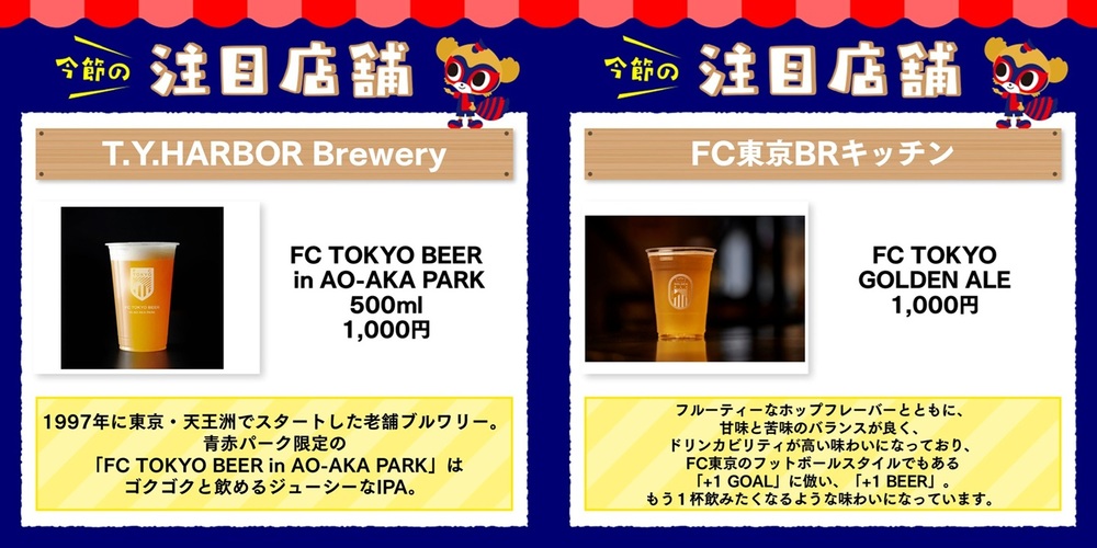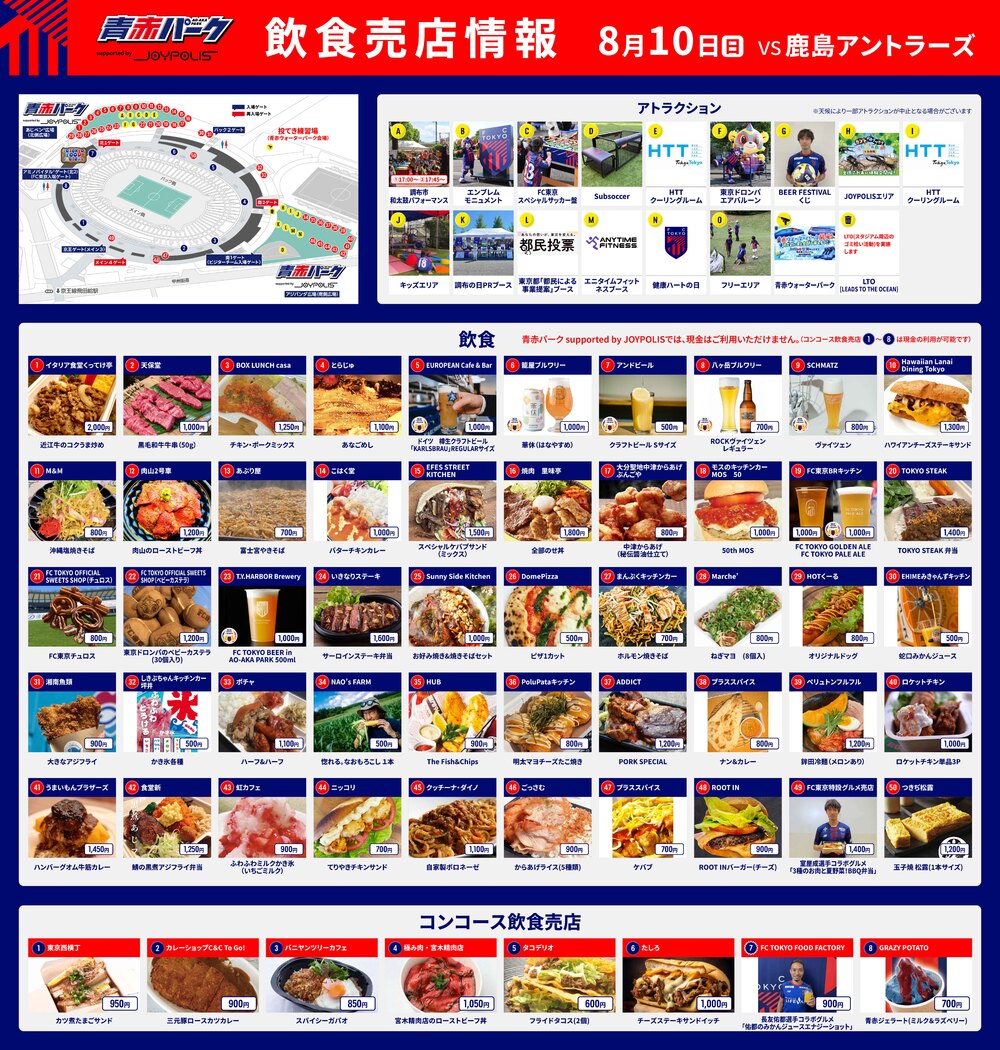 8月10日(周日)2025明治安田J1聯賽 第25節 鹿島Antlers戰(19:00開球/味之素體育館)的、AO-AKA PARK supported by JOYPOLIS (場外)、出張!! AO-AKA PARK supported by JOYPOLIS、體育館內走廊(場內)販賣部販售的飲食資訊通知您。