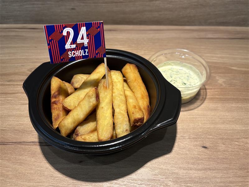 使用了舒爾茨選手最喜愛的地瓜,沾醬則選用了他故鄉丹麥的傳統塔塔醬。