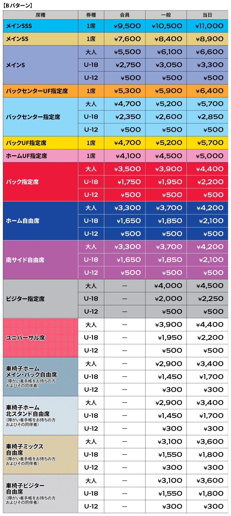 ※U-18票價適用於2008年4月2日以後出生者,U-12票價適用於2014年4月2日以後出生者。未就學兒童若坐在監護人膝上觀賽,則不需要購票。