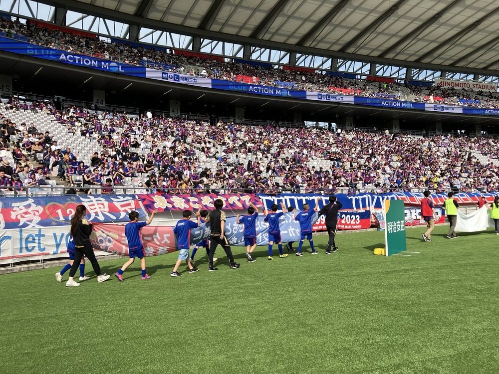 現在FC東京足球・五人制足球學校針對直屬校的學員,不定期於主場比賽時舉辦「橫幅走秀小朋友」活動♪