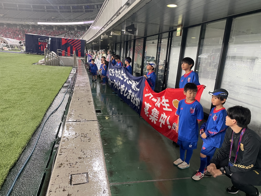在中場休息時拿著FC東京的學校橫幅,宣傳學校!