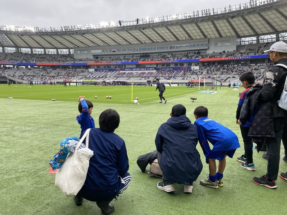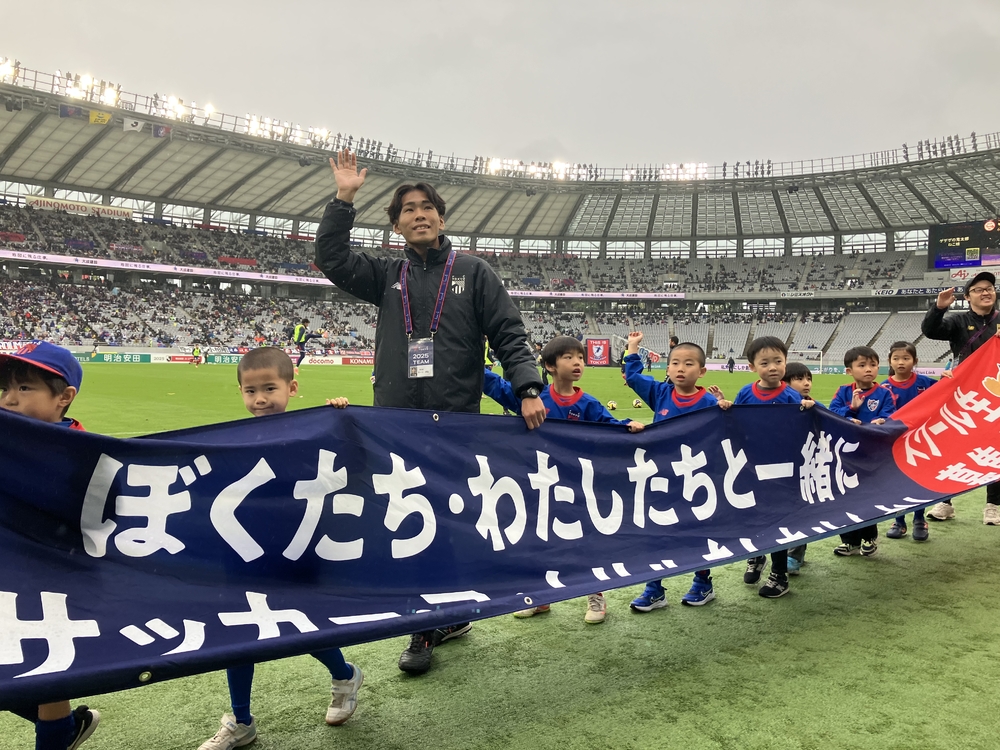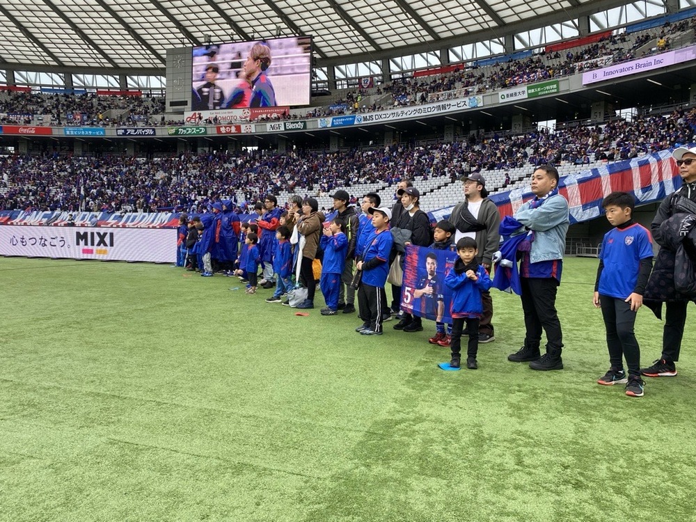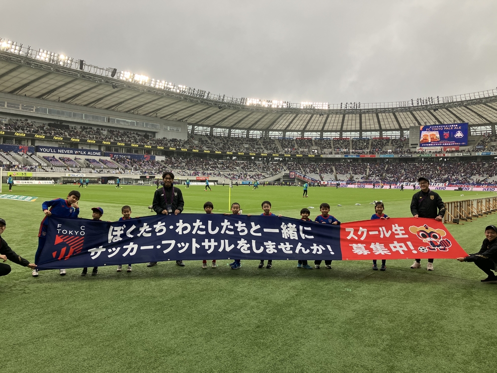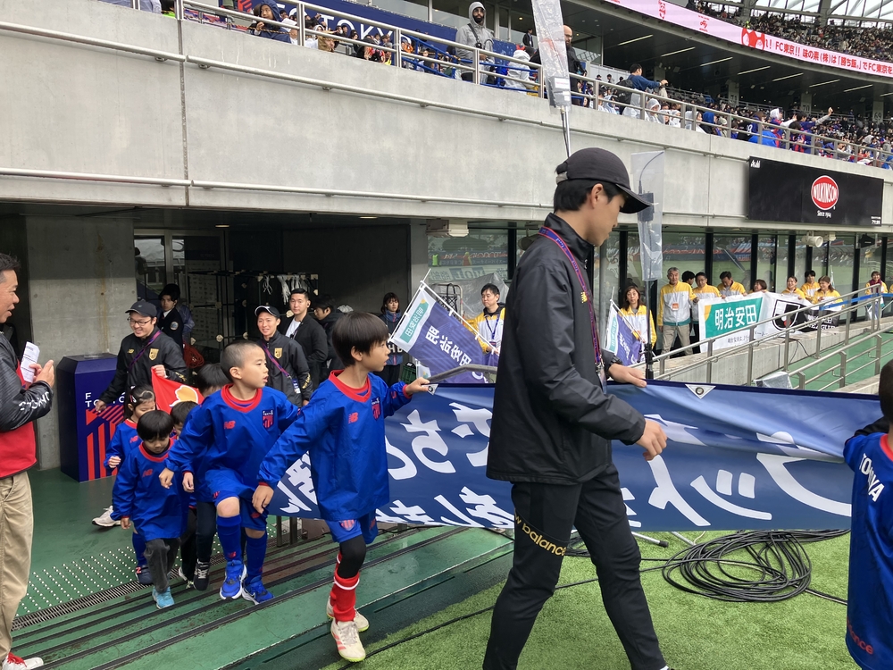 中場休息時,正在上學的小學1年級和6年級學生,手持FC東京足球・五人制足球學校的橫幅繞場一周!