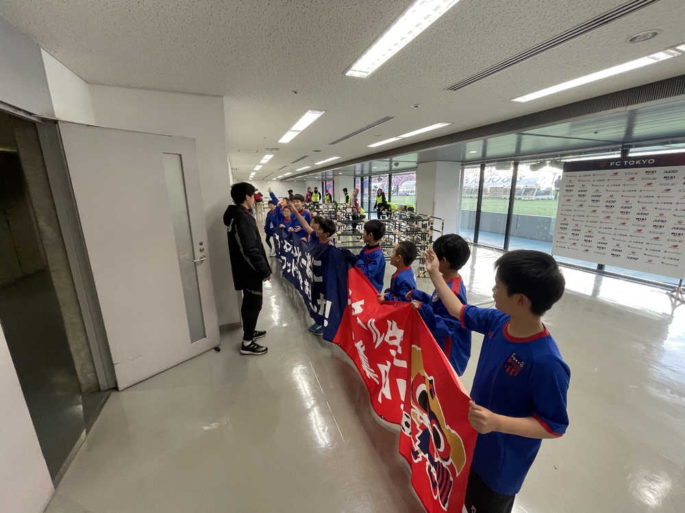 中場休息時,三年級和六年級的學童們手持FC東京足球・五人制足球學校的橫幅繞場一周!